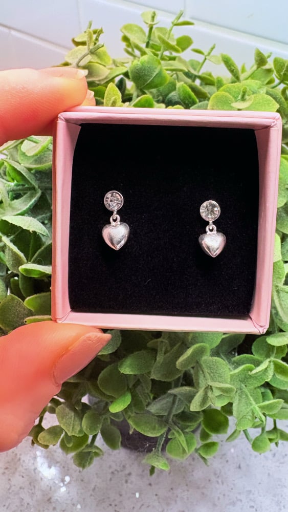 The cutest Cubic Zirconia stud earrings, with a delicate heart charm droplet. The stud measures approximately 4.5mm, while the heart charm measures 9.5 x 6.5mm.